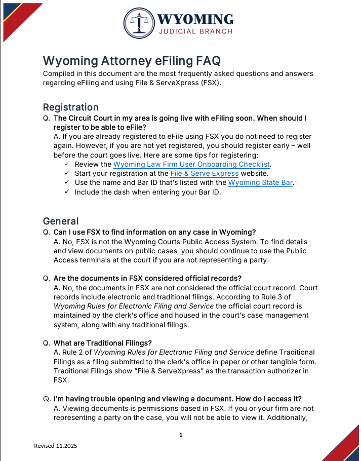 File & ServeXpress is the mandated eFiling Service Provider for Wyoming District Courts, Chancery Courts, and Circuit Courts.